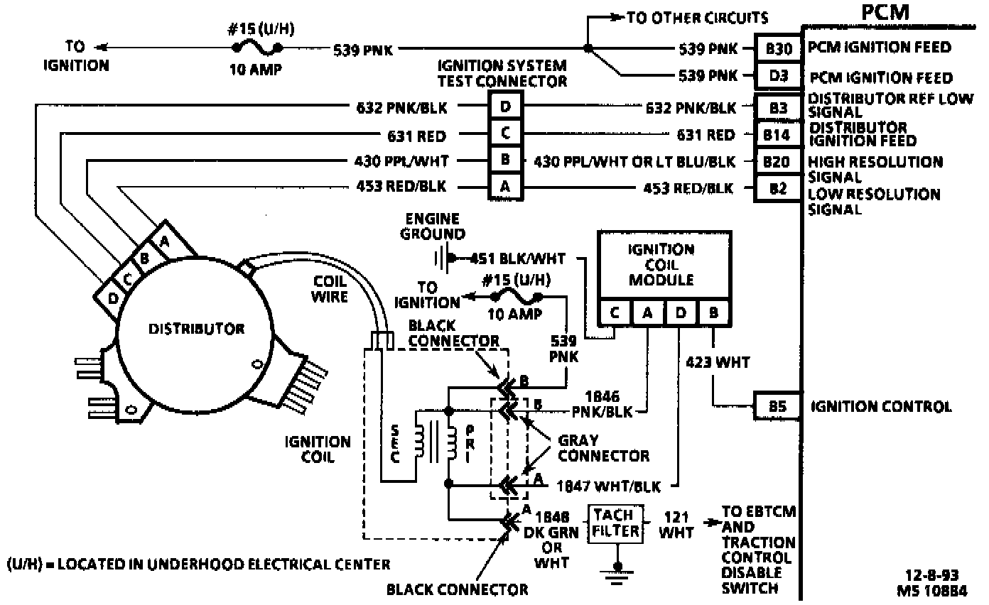 Once the PCM calculates ignition timing, the timing signal will be sent to the ignition coil module on the Ignition Control (IC) circuit. Each timing pulse received by the ignition coil module, on the IC circuit, will trigger the coil module to operate the ignition coil. Secondary ignition voltage is induced and is then sent to the distributor for distribution to each spark plug.