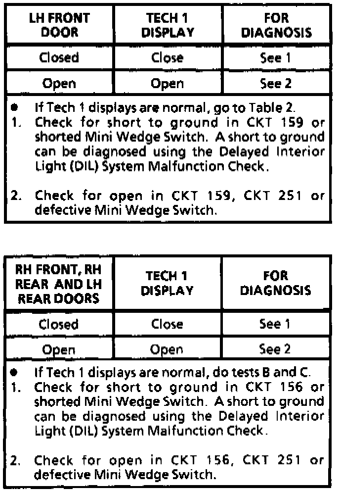 If upon using the Tech 1, the Door Mini Wedge Input Display stays at the same state, with no change displayed when shutting or opening the door(s), this condition will have to be repaired first before testing the Door Mini Wedge inputs.