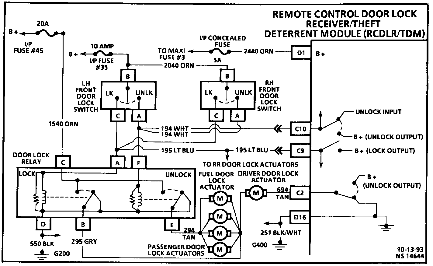 Lock function: Battery voltage is applied through the door lock relay and CKT 295 to the driver's door lock actuator. The driver's door lock motor is grounded through CKT 694 and the RCDLR//TDM. Unlock function: The RCDLR/TDM receiver applies voltage to the driver's door lock actuator through CKT 694. The driver's door lock actuator is grounded through CKT 295 and the door lock relay.
