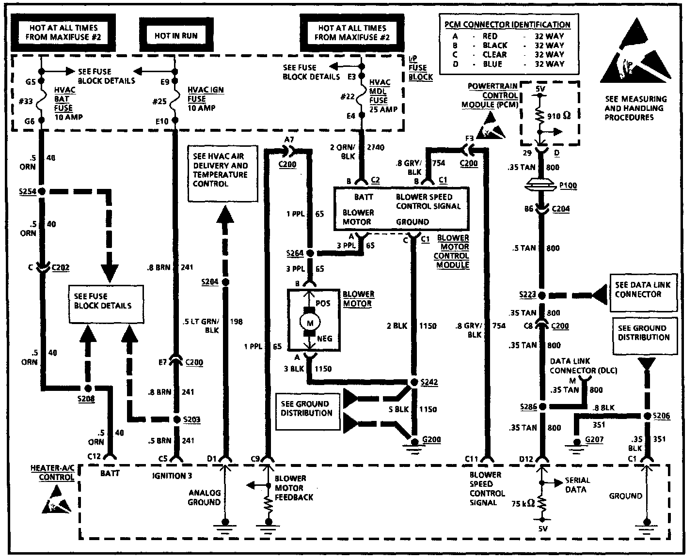 The H-A/C control sends blower request information to the blower motor control module in the form of a variable voltage signal. This voltage signal ranges from approximately 2.5 volts, for minimum blower motor speed, to approximately 7 volts, for maximum blower motor speed. An amplifier and driver circuit in the blower motor control module supplies between 4 and 12 volts to the blower motor according to the request signal from the H-A/C control. Blower motor voltage is also sent back to the H-A/C control to insure blower speed stability and to indicate any failure in the blower motor circuitry.