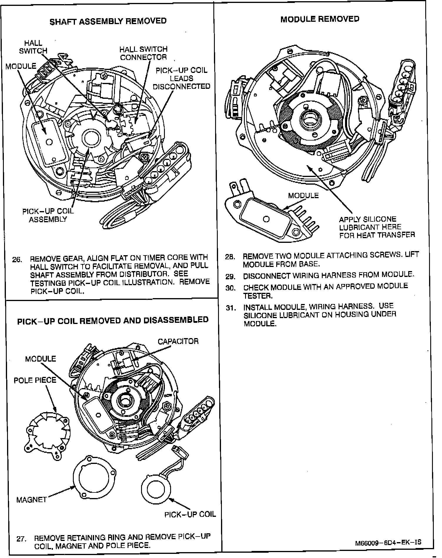 CAUTION: Do not wipe grease from ICM or distributor base if same ICM is to be replaced. If a new ICM is to be installed, a package of silicone grease will be included with it. Spread the grease on the metal face of the ICM and on the distributor base where the ICM seats. This grease is necessary for ICM cooling.