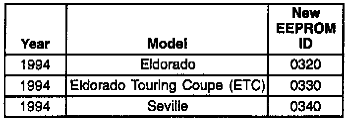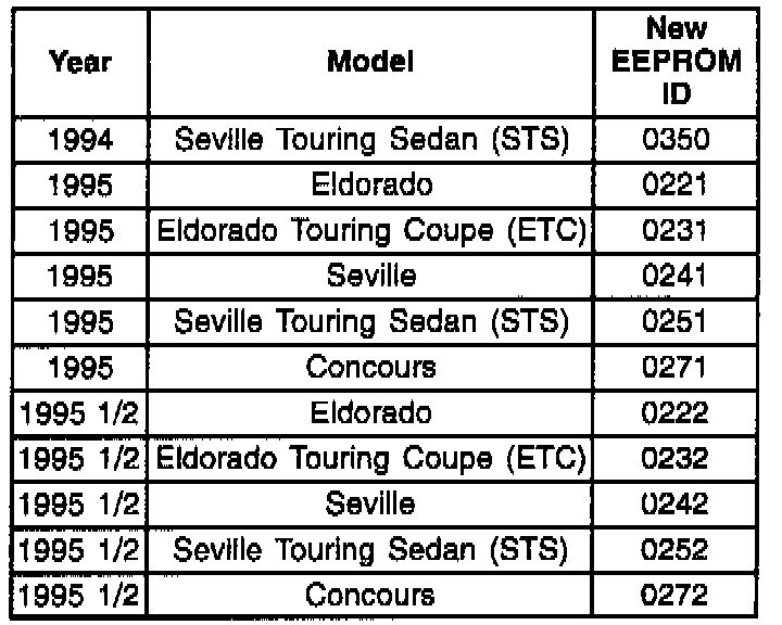 In August, 1995, a new version of the Tech 1 CD is being released which contains revised software for the 1994-95 Road Sensing Suspension (RSS) Systems. Any vehicle listed below with either of the above concerns should be recalibrated per the new EEPROM ID.