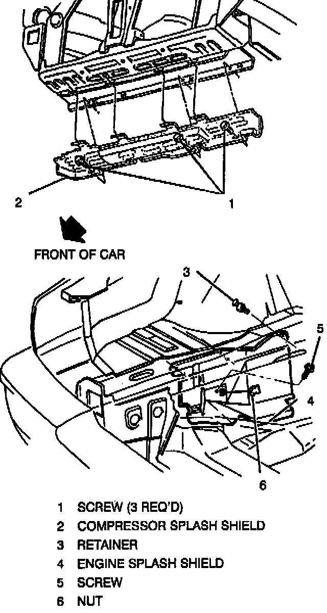 2. Compressor splash shield (three screws).