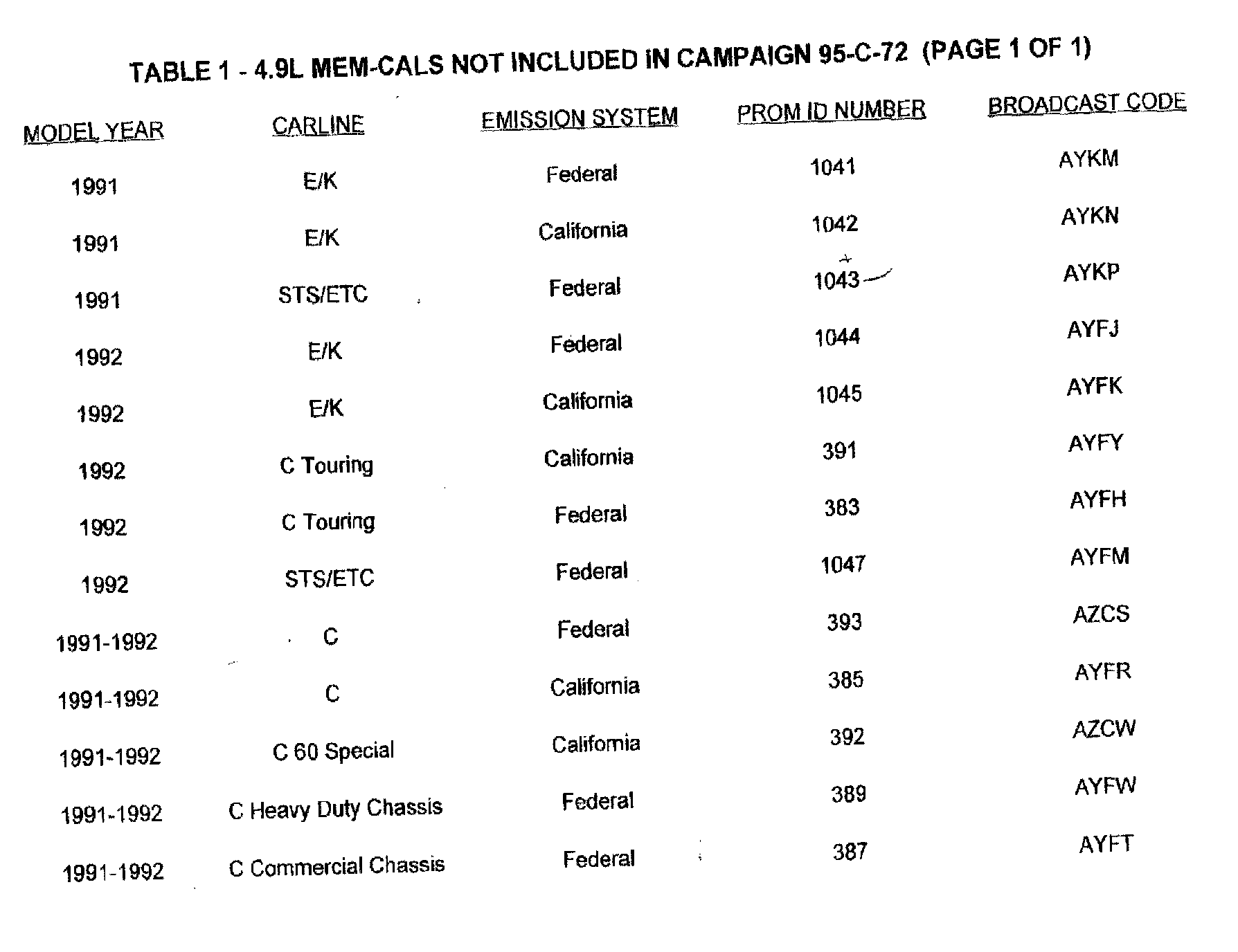 On 1991 and 1992 model vehicle only, if the PROM ID is the number, listed in Table 1 of this bulletin, or a lower number, the Mem-Cal should NOT be replaced. Proceed to Step 19.