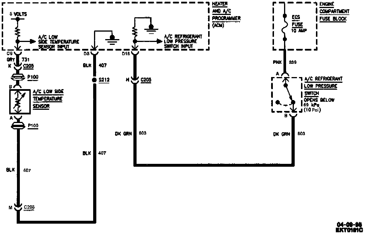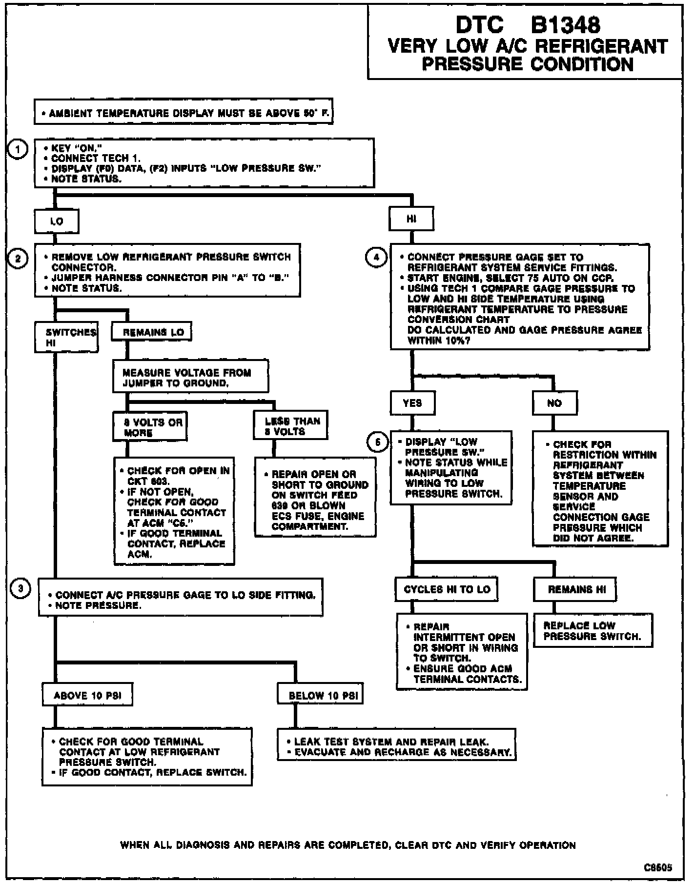 In the process of controlling the compressor clutch, the Air Conditioning Programmer (ACM) monitors certain system inputs for an indication of low refrigerant charge. The ACM monitors the normally closed low refrigerant pressure switch at pin "D14." The status of the low pressure switch is checked prior to compressor engagement. If the switch opens, the ACM sets DTC B1348 and the message "VERY LOW REFRIGERANT - A/C COMPRESSOR OFF" will be displayed on the Driver Information Center (DIC). If a DTC B1348 is set, the compressor clutch will disengage and remain disengaged until DTC B1348 is cleared.