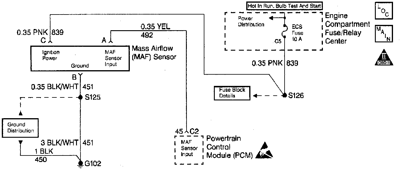 2. To aid in finding an intermittent, wiggle the MAF sensor connector, PCM connector and the wiring harness while noting the MAF sensor display on a scan tool. With a RUNNING engine a reading of 1.3 gms/sec or less would indicate no MAF sensor input to the PCM (an open, short poor connection or faulty component).