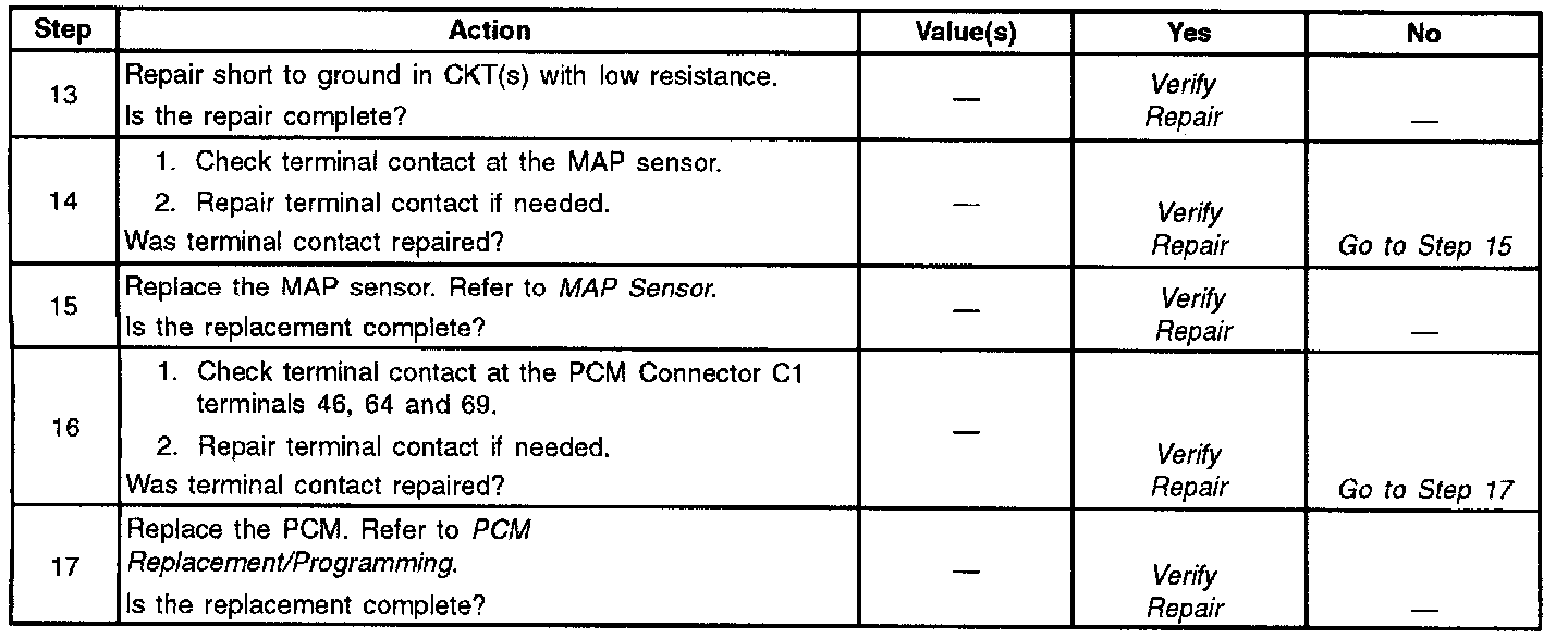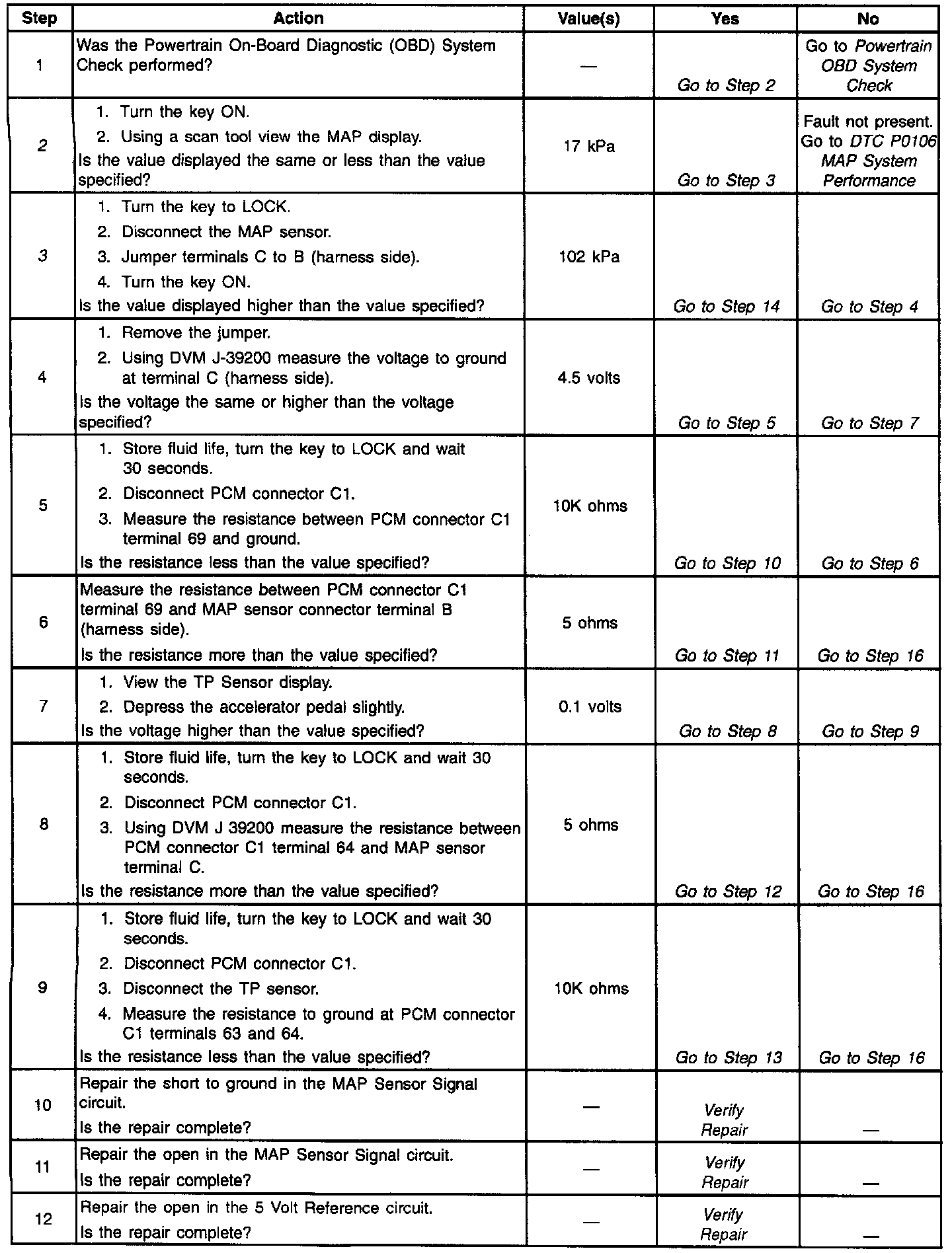 The Manifold Absolute Pressure (MAP) sensor is a sensor that changes resistance based upon manifold vacuum. The PCM provides a 5 volt reference and ground. The MAP sensor signal varies between ground and 5 volts as manifold vacuum varies. As MAP decreases, voltage decreases (low engine load, high vacuum). As MAP increases, voltage increases (high engine load, low vacuum). The PCM uses the MAP sensor values as an indicator of engine load. A short to ground or open condition would cause the MAP sensor signal to go low, setting DTC P0107.