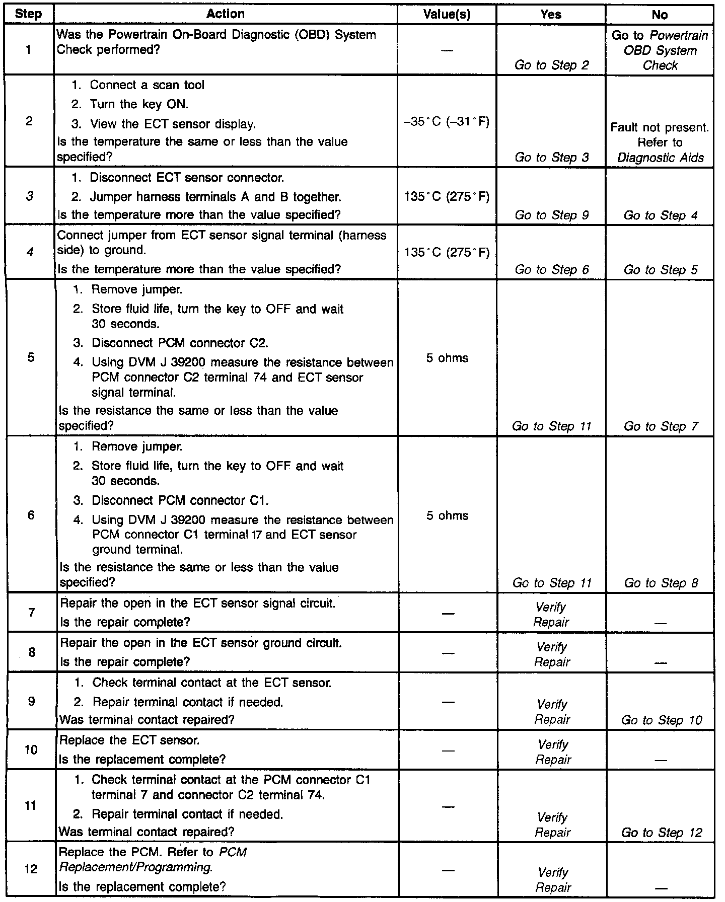 4. Checking for an open in the ECT sensor ground circuit. If shorting the ECT sensor signal circuit to ground causes ECT display to show 135°C (275°F) to 151°C (304°F), then there is an open in the ECT sensor ground circuit.