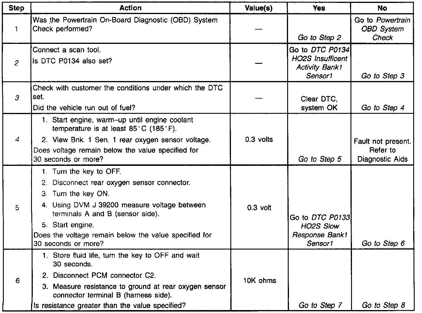 The PCM provides a 0.45 volt reference signal to the oxygen sensor on CKT 1666. When the oxygen sensor is cold, below 200°C (392°F), the oxygen sensor signal voltage will be around 0.45 volt and the PCM will keep the system in Open Loop operation. When the oxygen sensor is warm, above 200°C (392°F), the oxygen sensor will swing from rich to lean rapidly, if the PCM is in good control of the air fuel mixture. DTC P0131 is designed so that if the oxygen sensor stays at a lean voltage for more than 40 seconds during the test conditions, DTC P0131 will set. DTC P0131 will set when: