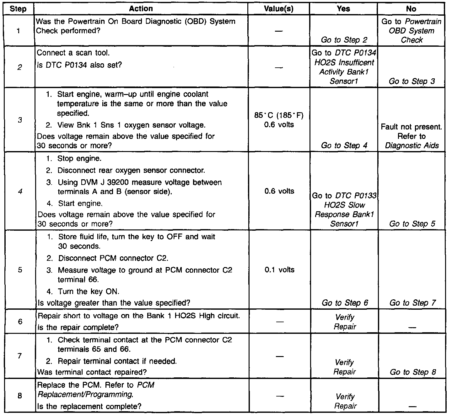 The PCM provides a 0.45 volt reference signal to the oxygen sensor on CKT 1666. When the oxygen sensor is cold, below 200°C (392°F), the oxygen sensor signal voltage will be around 0.45 volt and the PCM will keep the system in Open Loop operation. When the oxygen sensor is warm, above 200°C (392°F), the oxygen sensor will swing from rich to lean rapidly, if the PCM is in good control of the air fuel mixture. DTC P0132 is designed so that if the oxygen sensor stays at a rich voltage for 40 out of 50 seconds during the test conditions, DTC P0132 will set. DTC P0132 will set when: