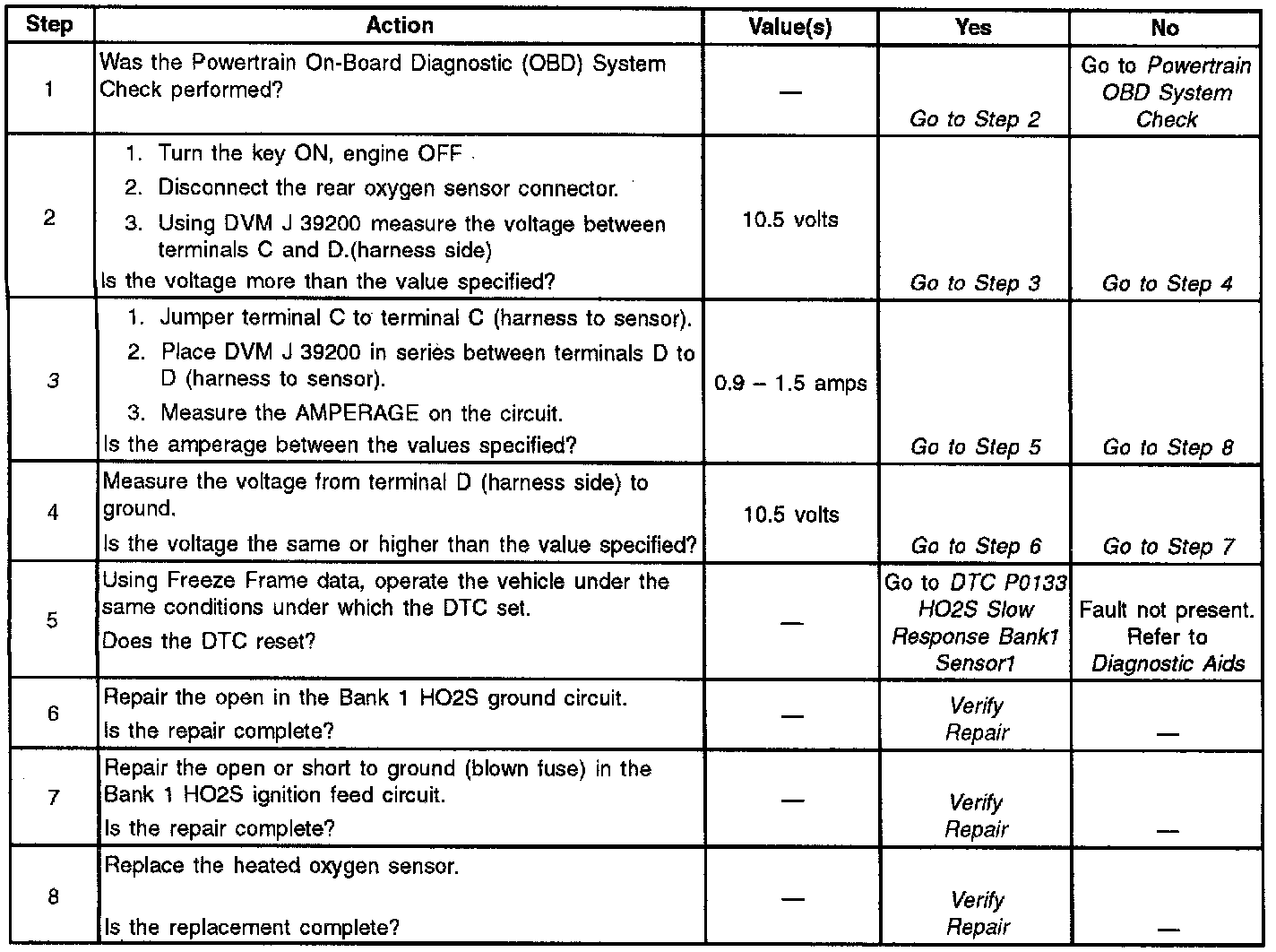 The PCM monitors the rear heated oxygen sensor input to determine when its voltage becomes either 151 millivolt less than or 151 millivolt greater than average rear heated oxygen sensor bias voltage for 0.1 second. If it takes too long, DTC P0135 will set.