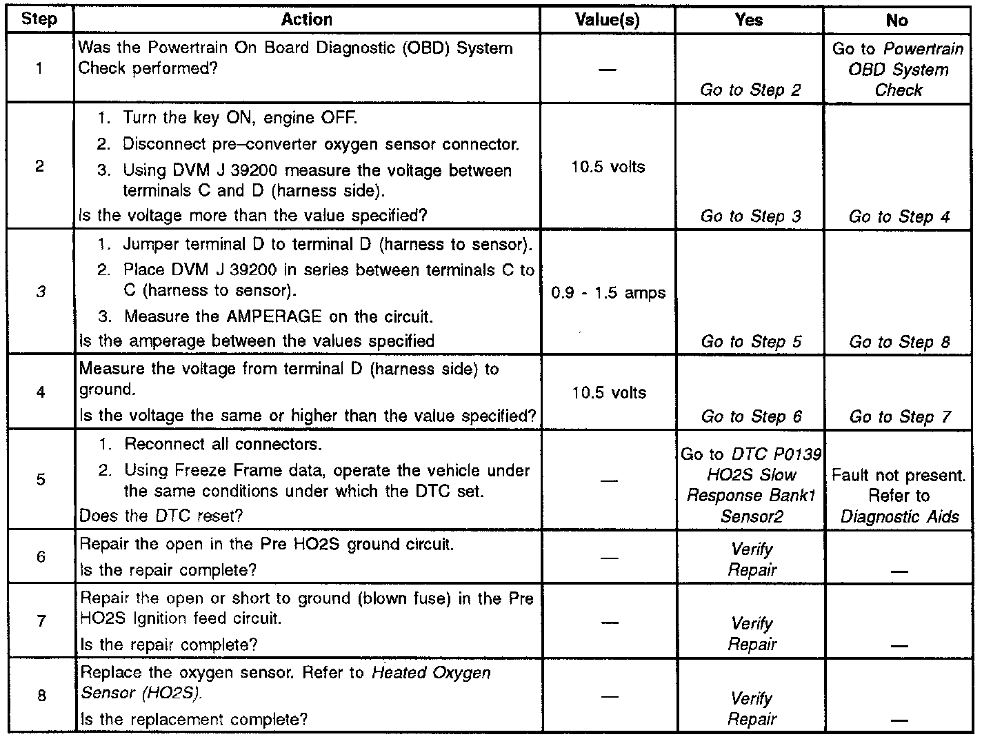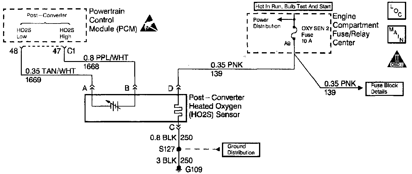 This diagnostic test is used to determine if the heating element in the pre-converter oxygen sensor is operating properly. An oxygen sensor acts as a battery because it creates its own voltage once it reaches operating temperature. This voltage is produced when the oxygen content in the exhaust stream is different than that in the atmosphere. The heating element is energized through CKT 39 when the ignition is ON and allows the oxygen sensor to reach operating temperature quickly. This in turn allows the PCM to enter Closed Loop fuel control quicker. When cold the voltage that the PCM measures on the HO2S HI and LOW inputs is called bias voltage. If it takes too long for the HO2S to very above or below the bias voltage within a specific time since key ON DTC P0141 will set