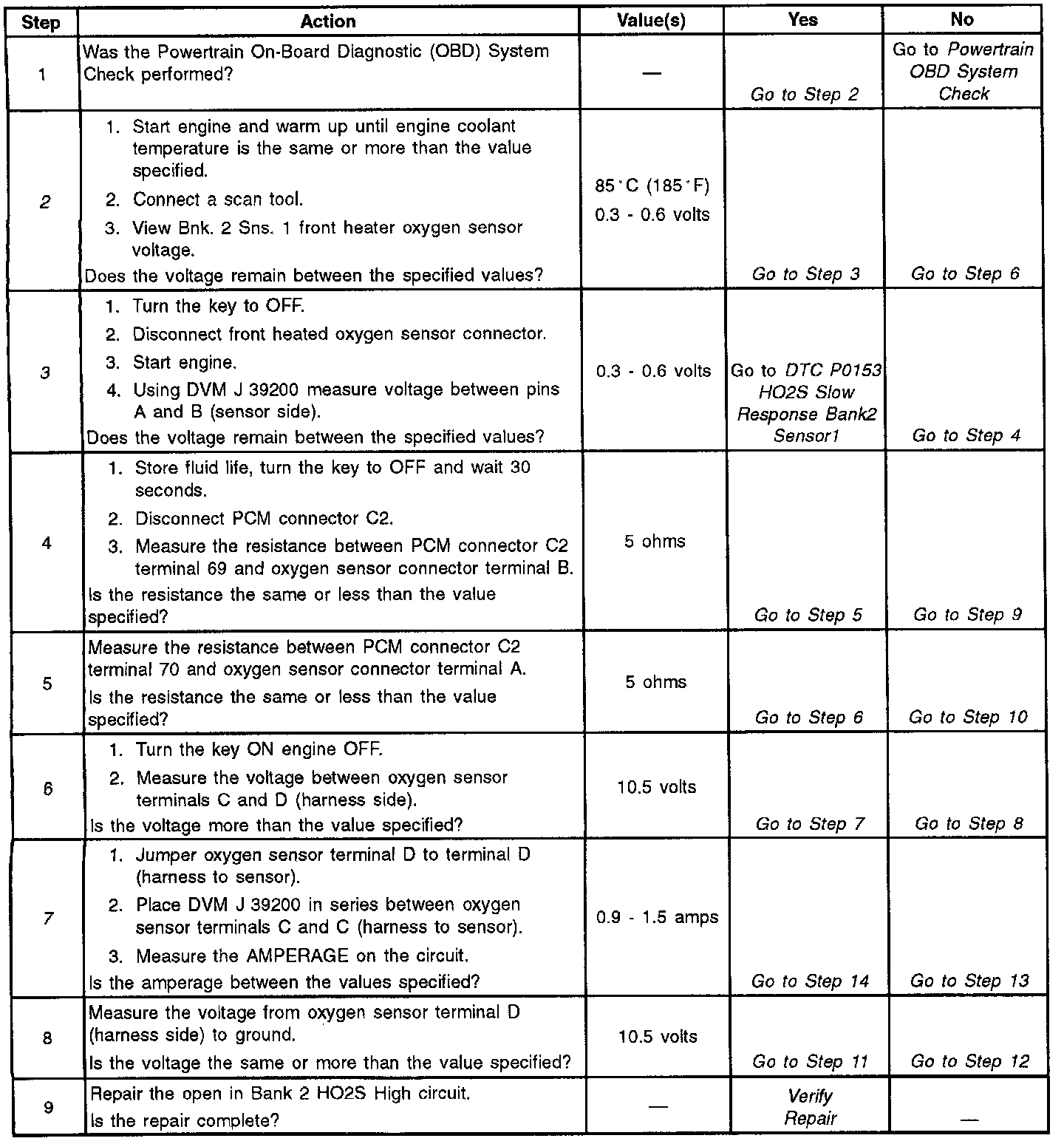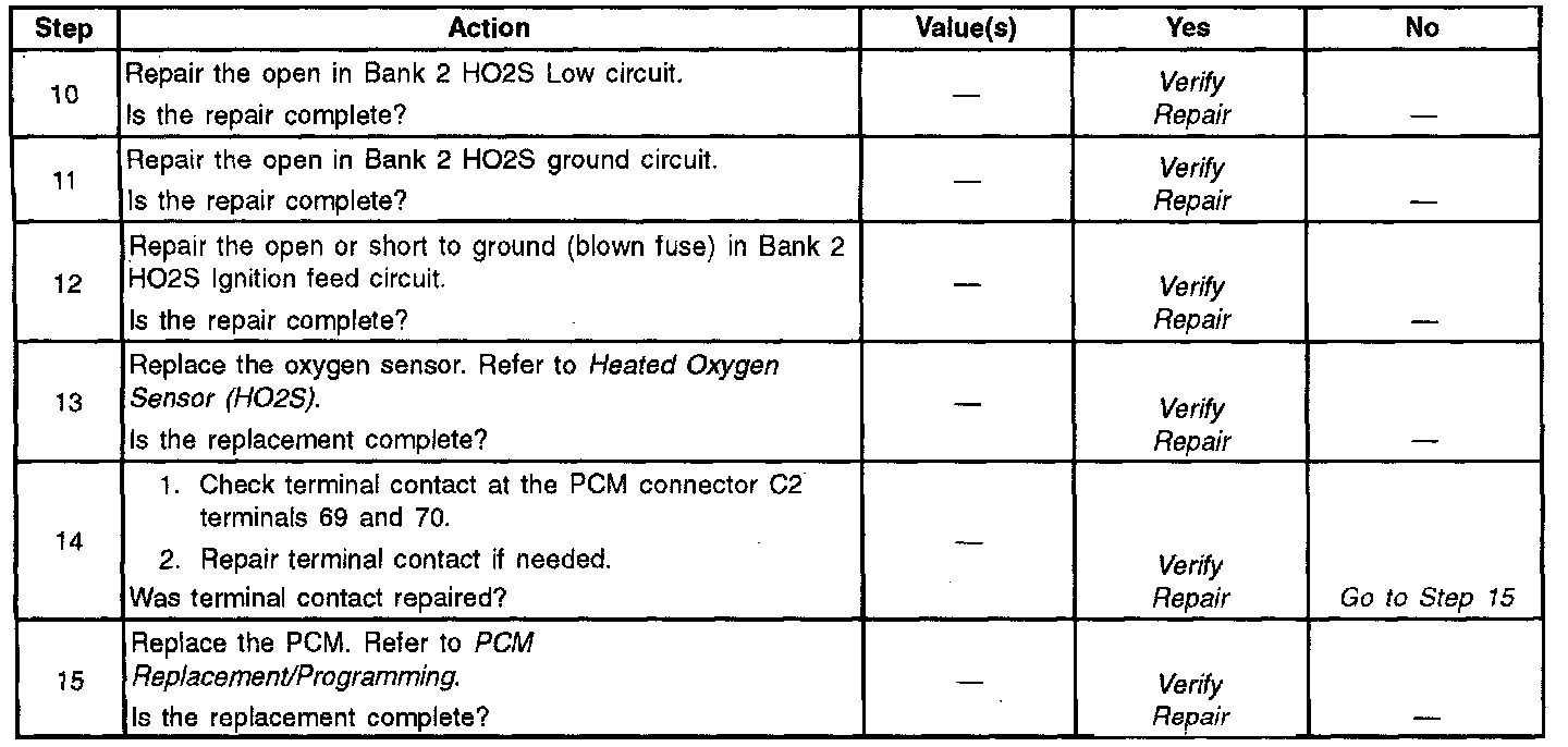 2. Voltage on scan tool should fluctuate above 0.6 volt and below 0.3 volt. If voltage remains above 0.6 volt, check Bank 2 HO2S High circuit for a short to voltage. If voltage remains below 0.3 volt, check Bank 2 HO2S High circuit for a short to ground.