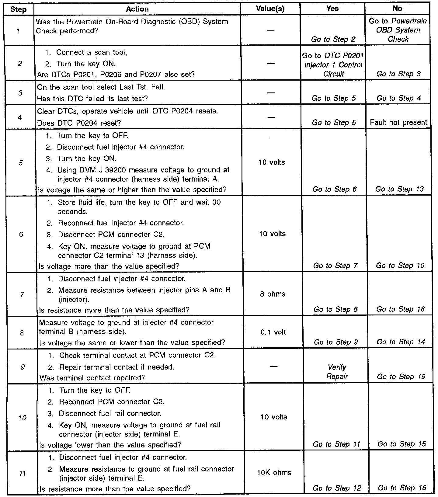 This PCM contains a General Field Effect Transistor Driver (GFD) that controls the eight fuel injector drivers. The GFD contains circuitry that is used to determine if there is a problem with any of the fuel injector circuits. The GFD has a fault line for each injector. The fault line goes high when an open, short to ground, or short to voltage is noticed in an injector circuit. DTC P0204 is set when the fault line for injector # 4 is high.