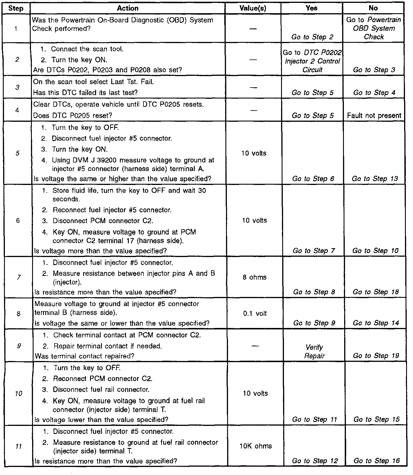 This PCM contains a General Field Effect Transistor Driver (GFD) that controls the eight fuel injector drivers. The GFD contains circuitry that is used to determine if there is a problem with any of the fuel injector circuits. The GFD has a fault line for each injector. The fault line goes high when an open, short to ground, or short to voltage is noticed in an injector circuit. DTC P0205 is set when the fault line for injector #5 is high.