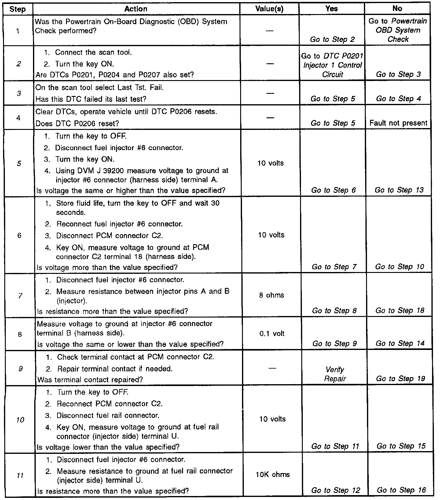 This PCM contains a General F.E.T. Driver (GFD) General Field Effect Transistor Driver that controls the eight fuel injector drivers. The GFD contains circuitry that is used to determine if there is a problem with any of the fuel injector circuits. The GFD has a fault line for each injector. The fault line goes high when an open, short to ground, or short to voltage is noticed in an injector circuit. DTC P0206 is set when the fault line for injector #6 is high.
