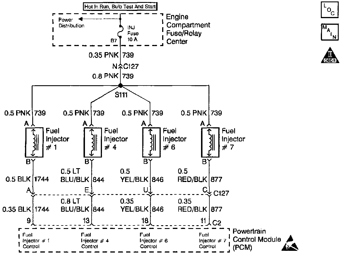 5. Checking to see if injector # 7 is receiving voltage. If not, the fault must be in the injector 1, 4, 6, 7 ignition feed circuit between the splice and injector # 7.