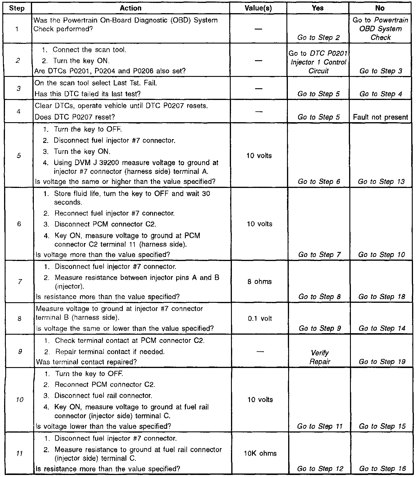 This PCM contains a General Field Effect Transistor Driver (GFD) that controls the eight fuel injector driver The GFD contains circuitry that is used to determine if there is a problem with any of the fuel injector circuits. The GFD has a fault line for each injector The fault line goes high when an open short to ground, or short to voltage is noticed in an injector circuit. DTC P0207 is set when the fault line for injector # 7 is high.