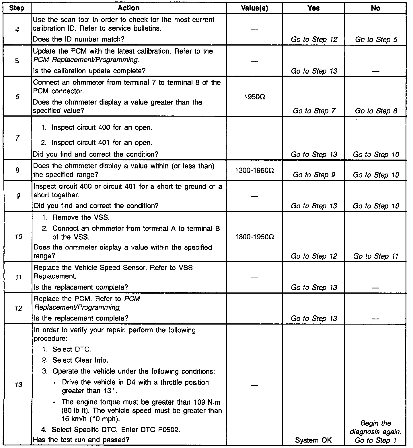 9. This Step verifies that the ohmmeter displays a value less than or equal to the specified VSS value. Resistance less than 1300 implies that the circuits are shorted together. Resistance within specification implies that circuit 400 or 401 is a possible short to ground.
