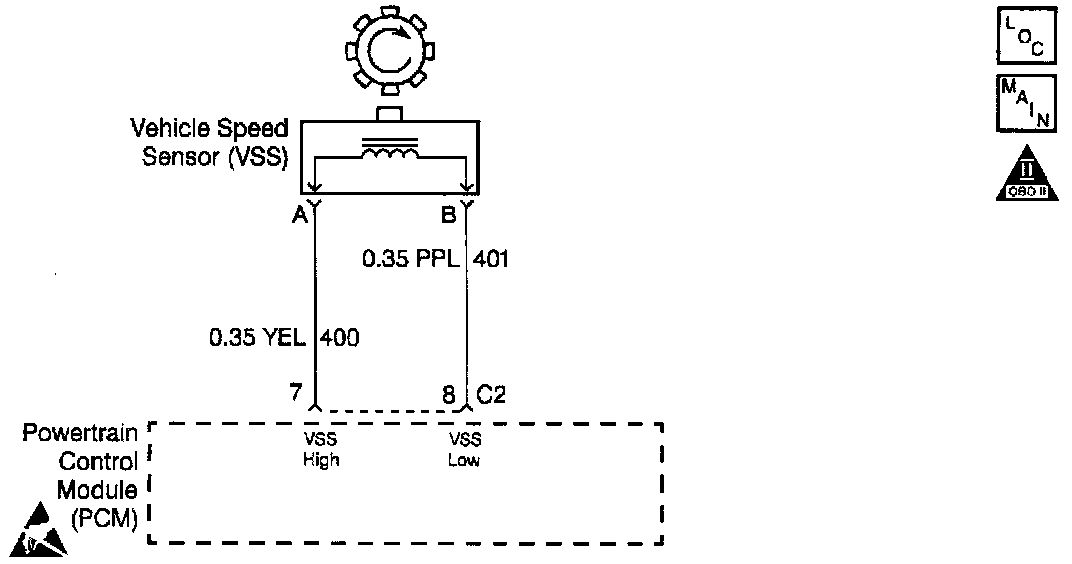 The Vehicle Speed Sensor (VSS) is a Permanent Magnet (PM) generator attached to the transmission case. The final drive assembly has a toothed wheel (VSS rotor). As the final drive assembly rotates, an AC voltage is induced and transmitted to the PCM. The PCM converts the AC voltage into a digital signal. The PCM uses the vehicle speed in order to determine shift timing, Torque Converter Clutch (TCC) apply and release, and gear ratio. The VSS voltage will vary from 0.5 volts AC at 100 RPM to more than 100 volts AC at 8000 RPM. The VSS resistance value is 1300-1950 ohms.