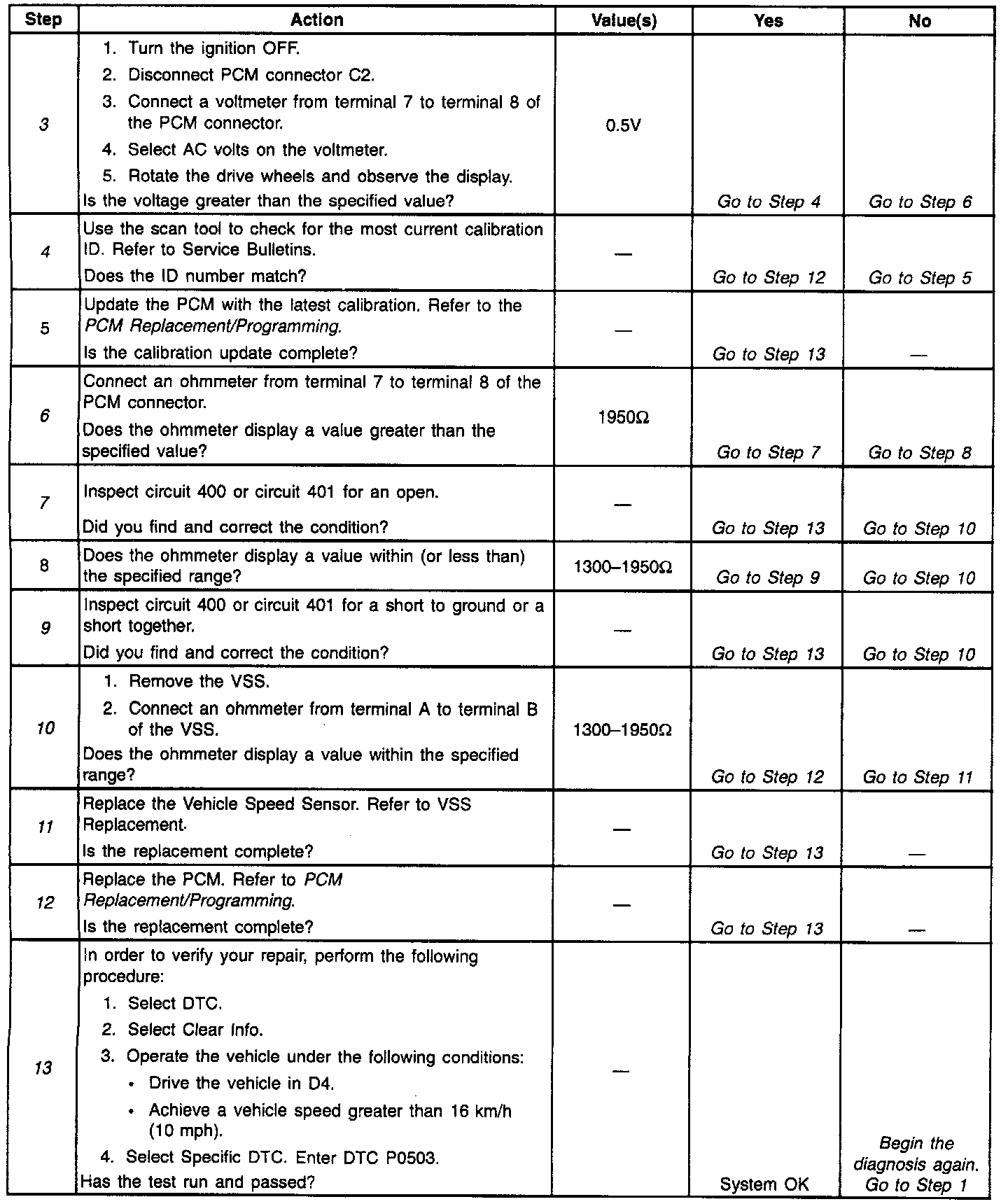 9. This Step verifies that the ohmmeter displays a value less than or equal to the specified VSS value. Resistance less than 1300 implies that the circuits are shorted together. Resistance within specification implies that circuit 400 or circuit 401 has a possible short to ground.