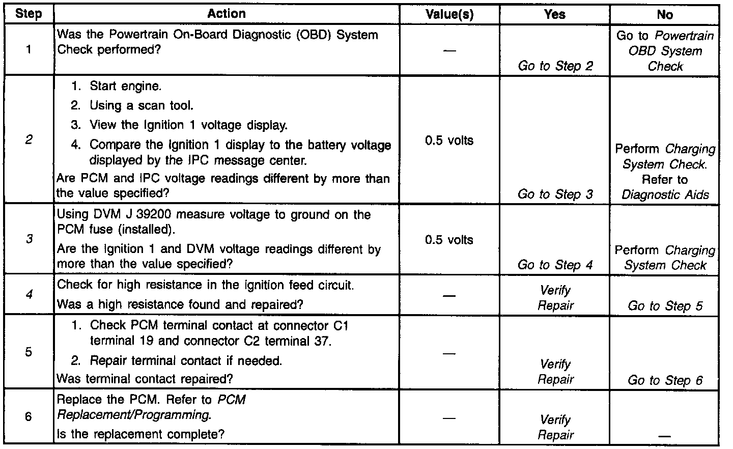 2. If ignition voltage and IPC battery voltage are within 0.5 volt of each other, there may be a system voltage problem. If they are not within 0.5 volt of each other, find out why the PCM is different.