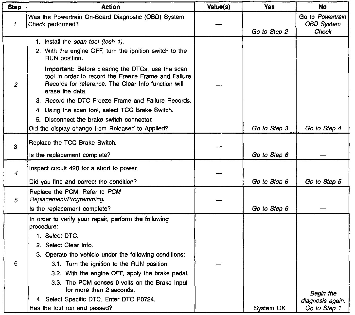 When the PCM detects a status change on the bake lamp circuit and the extended travel brake switch input a transition on the TCC brake switch input, then DTC P0724 sets. DTC P0724 is a Type C DTC.