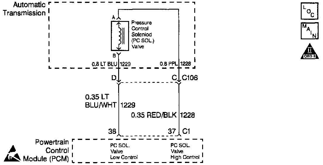 The Pressure Control Solenoid Valve (PC Sol. Valve) regulates actuator teed fluid passing through the solenoid into torque signal pressure. The PCM uses a pulse width modulated signal in order to control the torque signal pressure. The PCM compares various inputs in order to determine the appropriate pressure for a given load. The PCM varies the current to the PC Sol. Valve from 0.1-1.1 amp. An internal current monitor within the PCM provides feedback in order to determine actual PC Sol. Valve current draw.