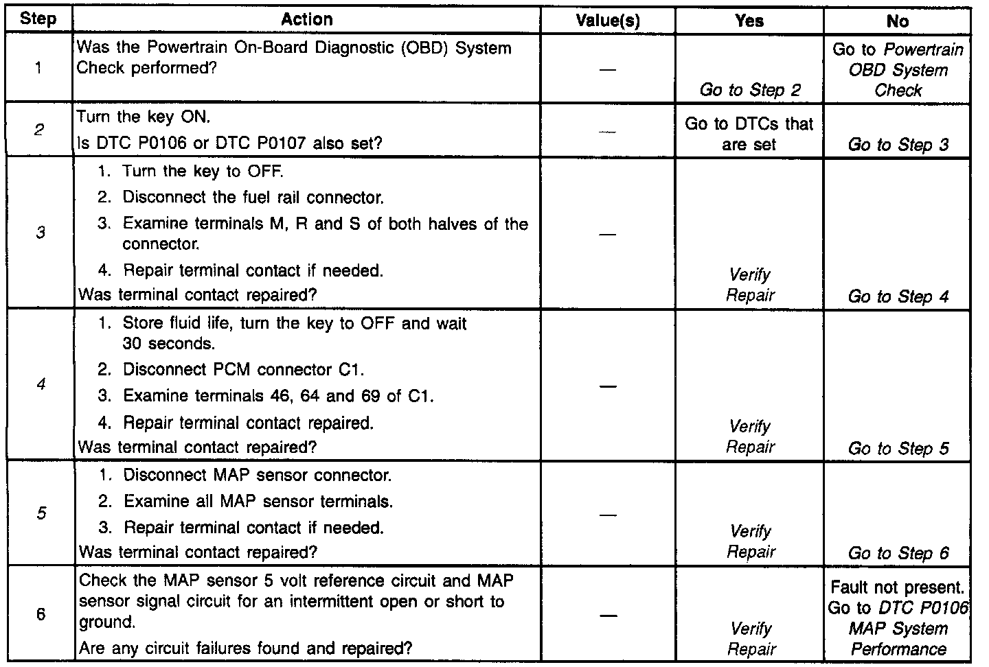 2. If DTC P0106 or P0107 are also set, diagnose them first because it may help to diagnose an intermittent MAP sensor.