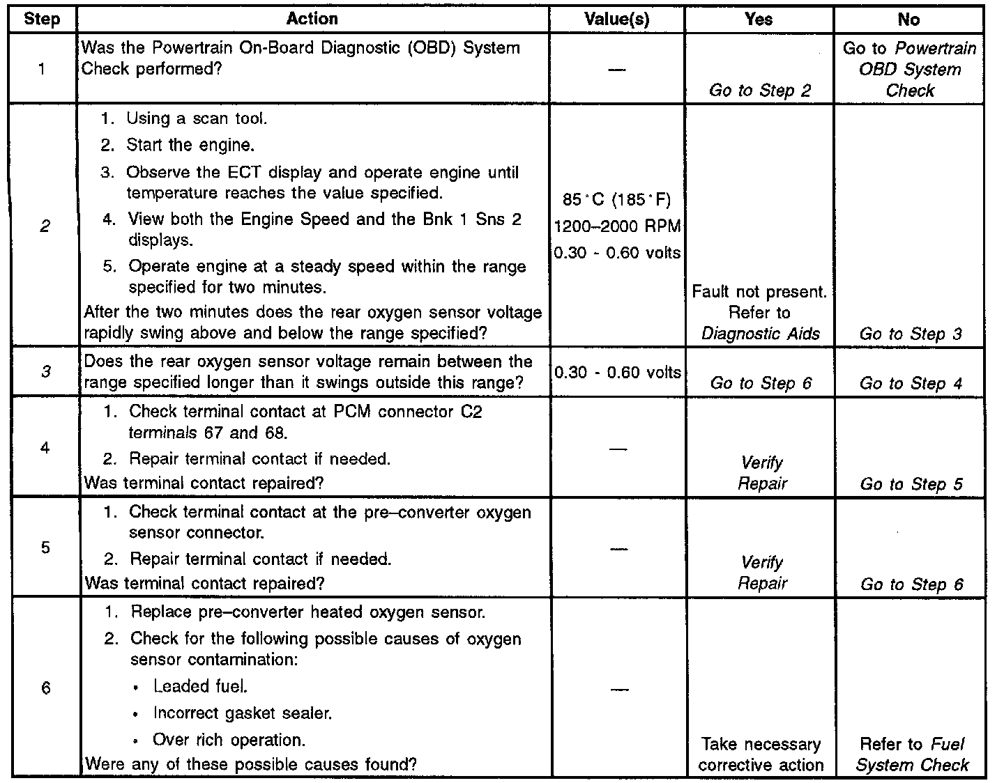 2. With the engine running warm, coolant at least 85°C (85°F) and at fast idle, the oxygen sensor voltage should rapidly swing above 0.60 volt and below 0.30 volt.