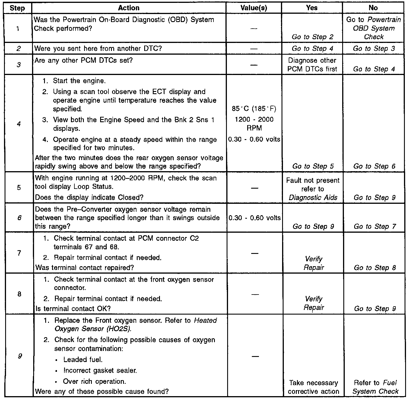 6. Checking if the oxygen sensor voltage is swinging between rich and lean very slowly, or not at all.