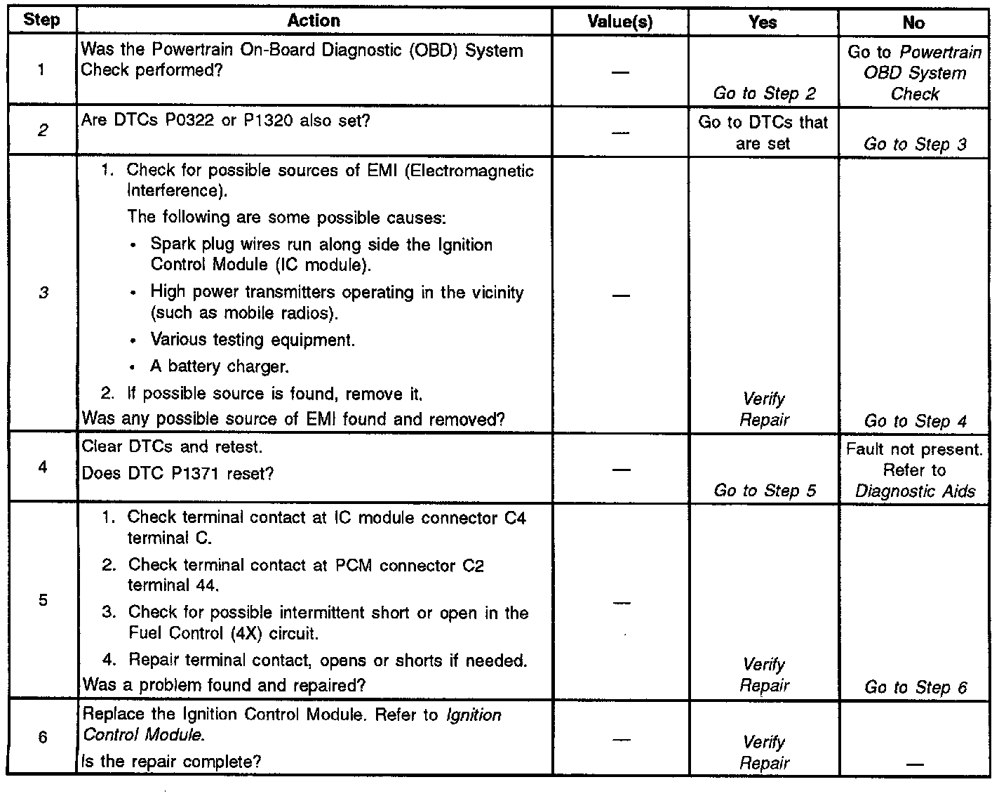 This diagnostic test checks for too few 4X reference pulses between CAM pulses. The PCM checks to see if there are forty eight 24X reference pulses between CAM pulses, and if there are, the PCM assumes it is receiving valid cam pulses. Therefore, if the PCM sees less than eight 4X reference pulses between cam pulses, it sets DTC P1371, because the 4X reference signal must be faulty.