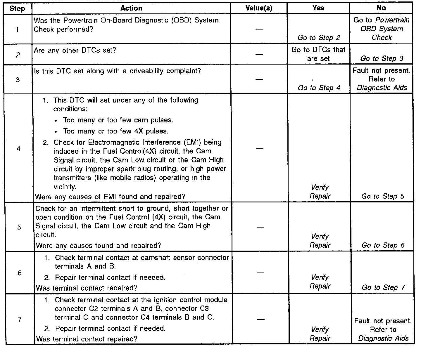 This diagnostic test checks to see if there are eight 4X reference pulses between CAM signals. Do not attempt diagnosis or repair unless the customer is experiencing driveability problems associated with this DTC.