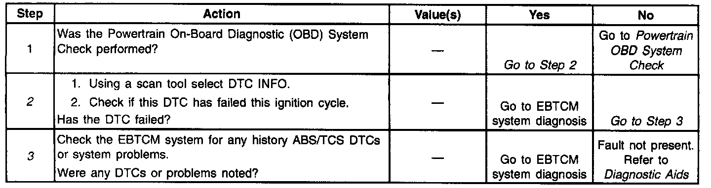 2. If this DTC is set current, refer to ABS diagnosis and diagnose any EBTCM related Anti-lock Brake System/Traction Control System (ABS/TCS) DTCs before diagnosing any PCM DTCs. If no EBTCM DTCs are present, perform the ABS System Check. Testing and Inspection
