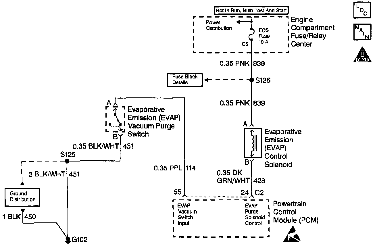 Notice: Never apply voltage to the EVAP vacuum switch. The voltage supplied by the PCM is of a low current design. Switch damage could result if jumpered to voltage.