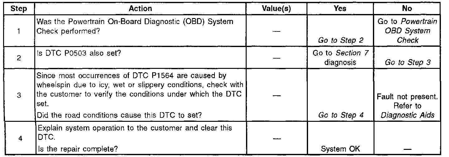 This diagnostic test is designed to set when the vehicle speed is increasing at an extremely rapid rate (wheelspin). It is a protective measure to disable the cruise control when the vehicle suddenly accelerates for example, when traveling on icy roads. Under these conditions, DTC P1564 will set and should be considered normal. The driver should be advised why the cruise disengaged. Clear the DTC and road test vehicle to verify normal operation.