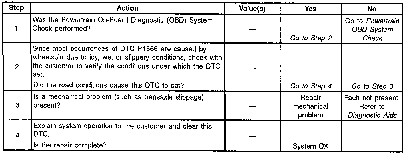 This diagnostic test will set if engine speed exceeds 5975 RPM while cruise control is engaged. This may occur on slippery pavement, extended wide open throttle acceleration, or for some mechanical problems (such as transaxle slippage). Under these conditions, DTC P1566 will set and should be considered normal. The driver should be advised why the cruise disengaged. Clear the DTC and road test vehicle to verify normal operation.