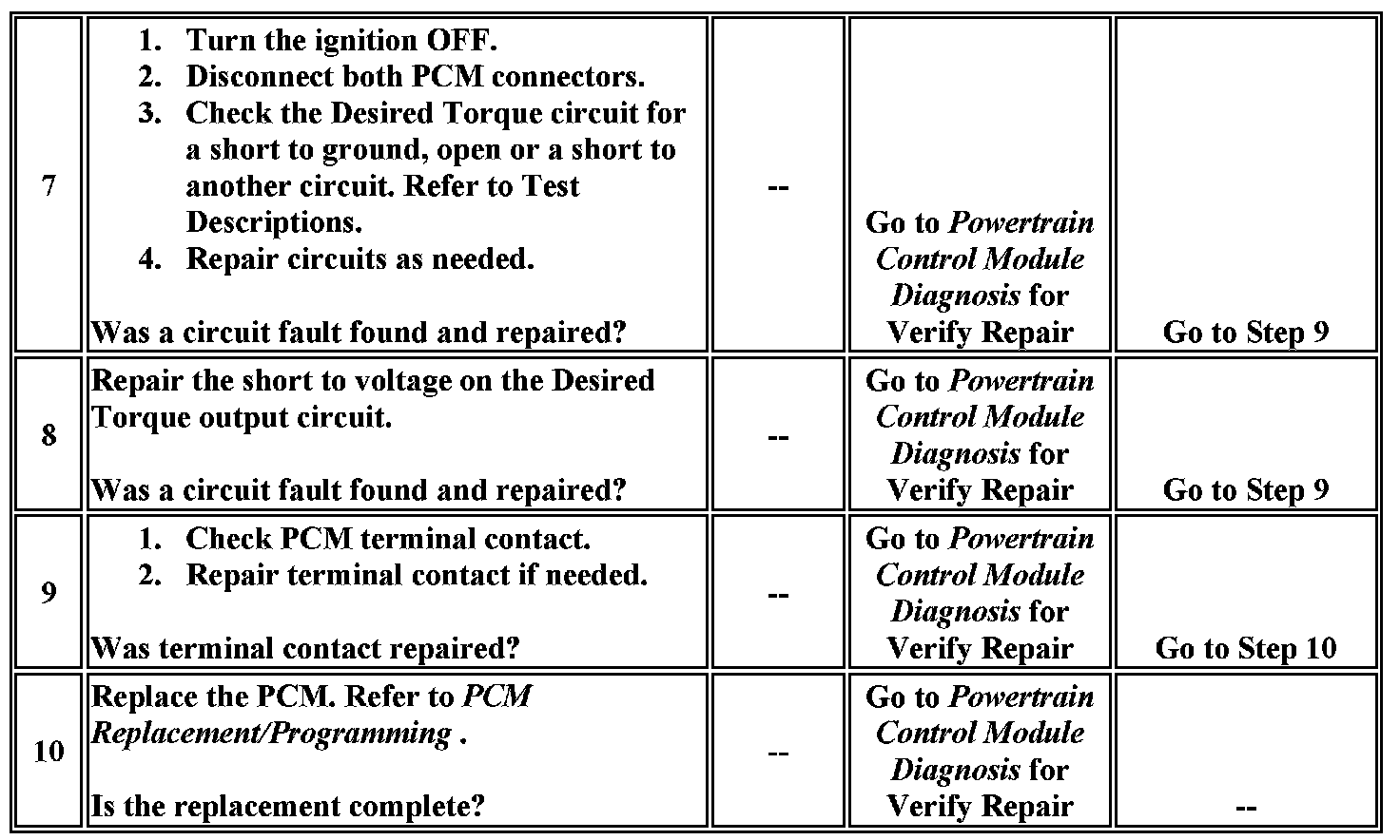 5. To determine if a short exists between the Desired Torque circuit and another 5 volt circuit (I.E. MAP reference, ECT signal, ect.) disconnect both PCM connectors and measure the resistance between the Desired Torque circuit and all other PCM terminals. Resistance between circuits should measure infinite (OL).