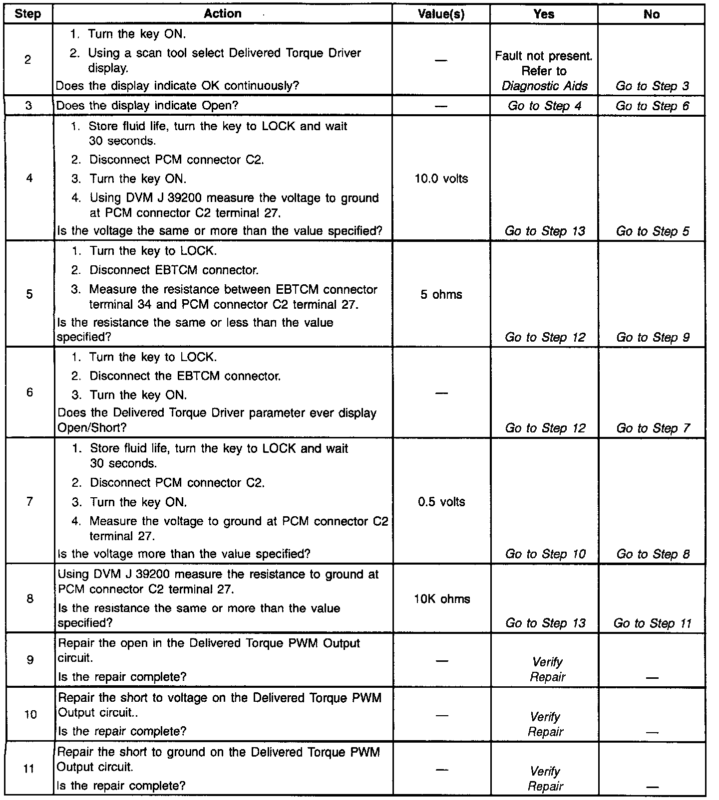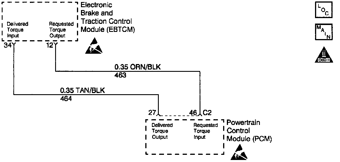 The PCM contains chips called Output Driver Modules that provide 7 switchable ground outputs for operating solenoids, relays, telltales, and other devices. Each of these ground outputs has an internal fault line that feeds back to the PCM's microprocessor. When the output is OFF, the output driver should receive the 12 volts fed to the solenoid, relay, etc. When the output is ON, it should receive 0 volt since it is grounding the output. If it receives 0 volt when the output is OFF or 12 volts when the output is ON, it sets the fault line low. DTC P1644 is used to monitor the fault line of the delivered torque output to the Electronic Brake and Traction Control Module (EBTCM). The EBTCM sends ignition voltage on CKT 464 to the PCM, the PCM will then rapidly pulse CKT 464 to ground creating a Pulse Width Modulated (PWM) signal that indicates the percentage of torque output the engine is producing. The EBTCM uses this PWM signal for traction control.
