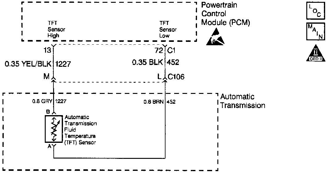Ignition voltage is provided to the Torque Converter Clutch Solenoid Valve (TCC Sol. Valve). The PCM controls the ON and OFF time of the solenoid by providing a ground through Output Driver Module (0DM) B. The PCM uses a Pulse Width Modulation (PWM) duty cycle, in order to control application and release of the TCC. When the solenoid is commanded OFF, the PCM senses high volts. When the solenoid is commanded ON, the PCM senses low volts.