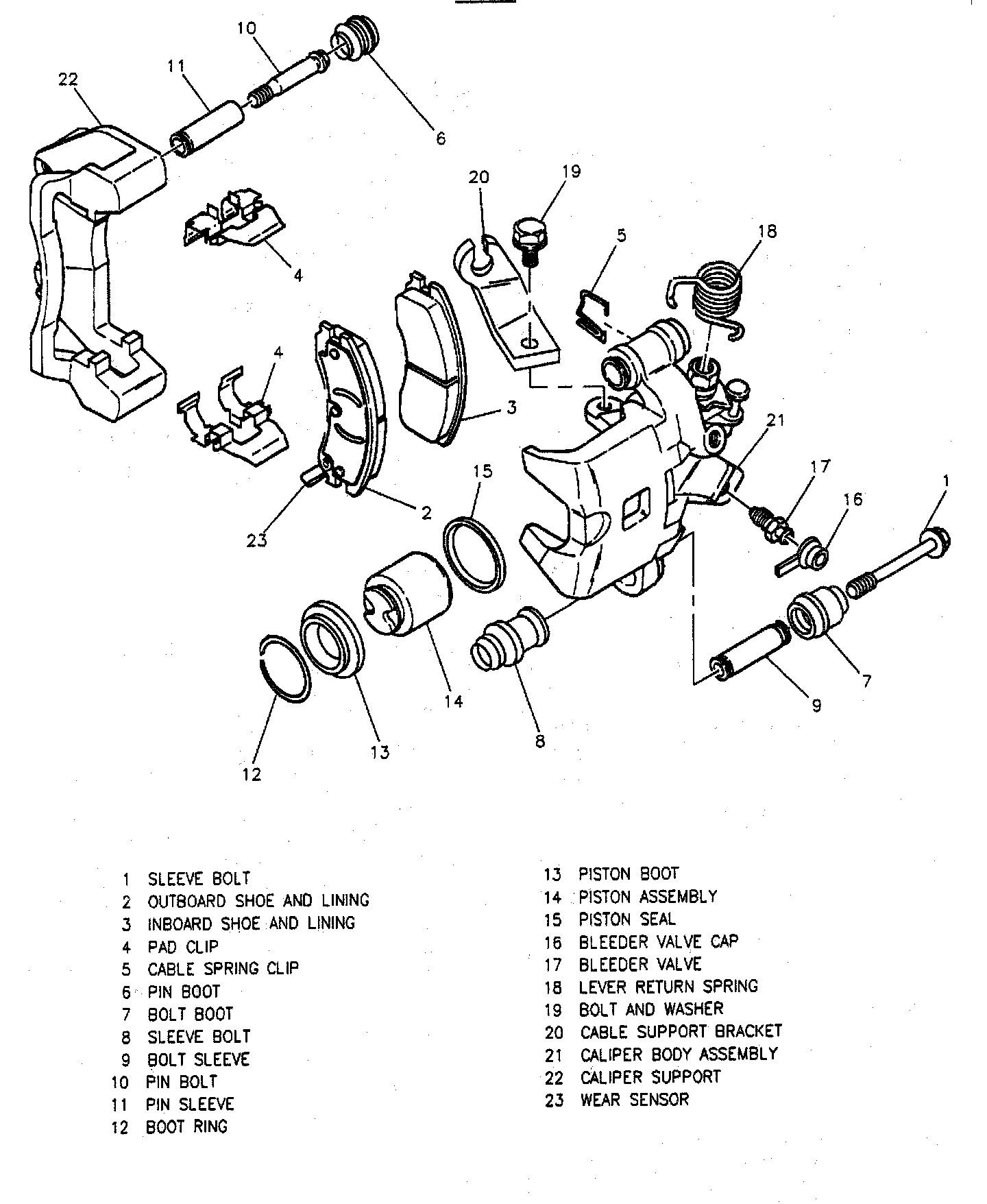 4. Bolt and washer attaching cable support bracket to caliper body assembly.