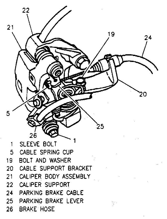 Note:It is not necessary to disconnect parking brake cable from caliper parking brake lever or disconnect brake hose unless caliper is to be completely removed from vehicle (refer to CALIPER section). Freeing cable support bracket allows enough flexibility in cable to pivot caliper up and remove pad and linings.
