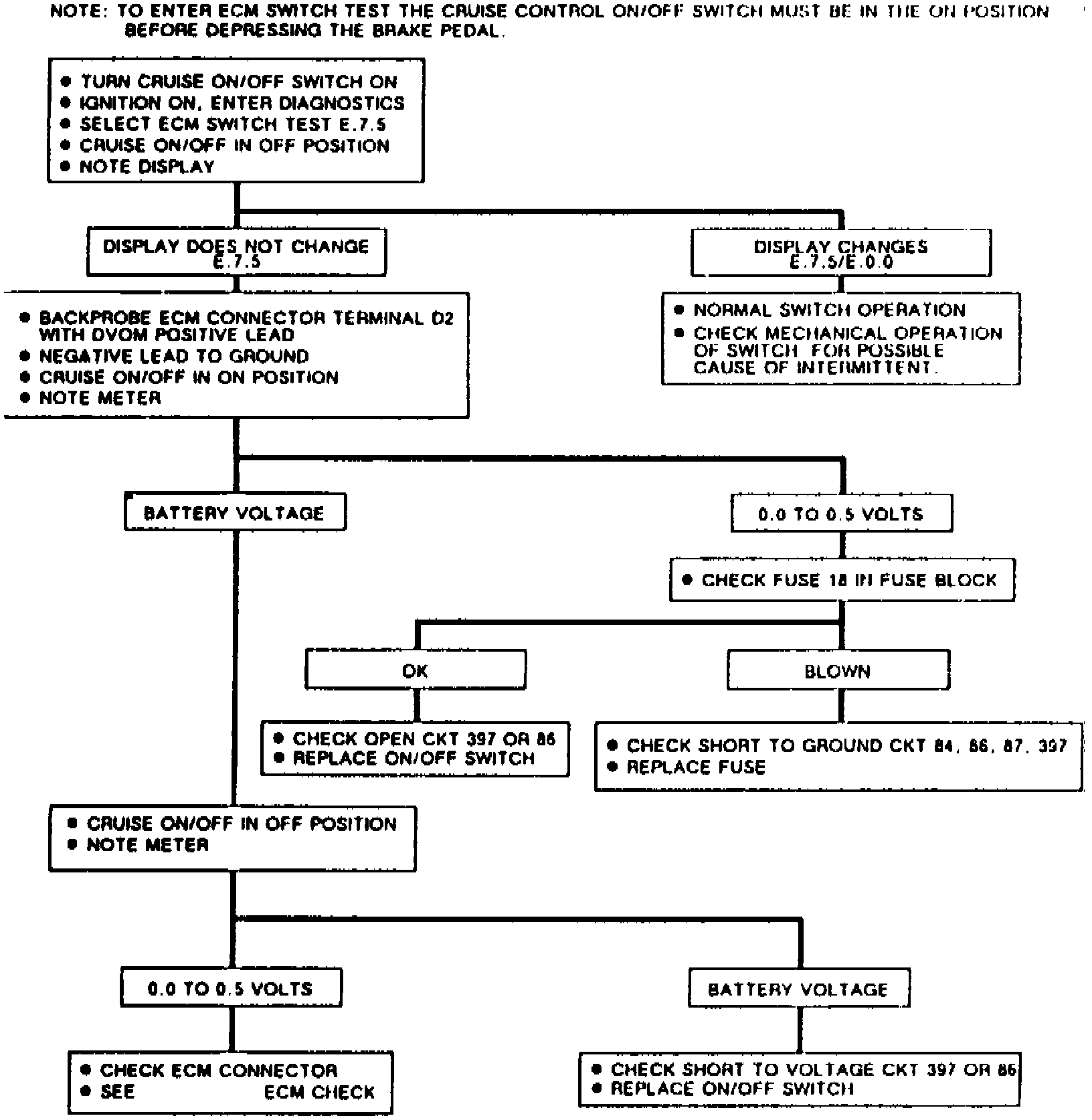 3. With code diagnostic trouble E.7.5 displayed, turn cruise control switch from off to on, then back to off to test operation of switch. Refer to Fig. 7 for further testing procedure. For intermittent diagnostic trouble codes proceed as follows: