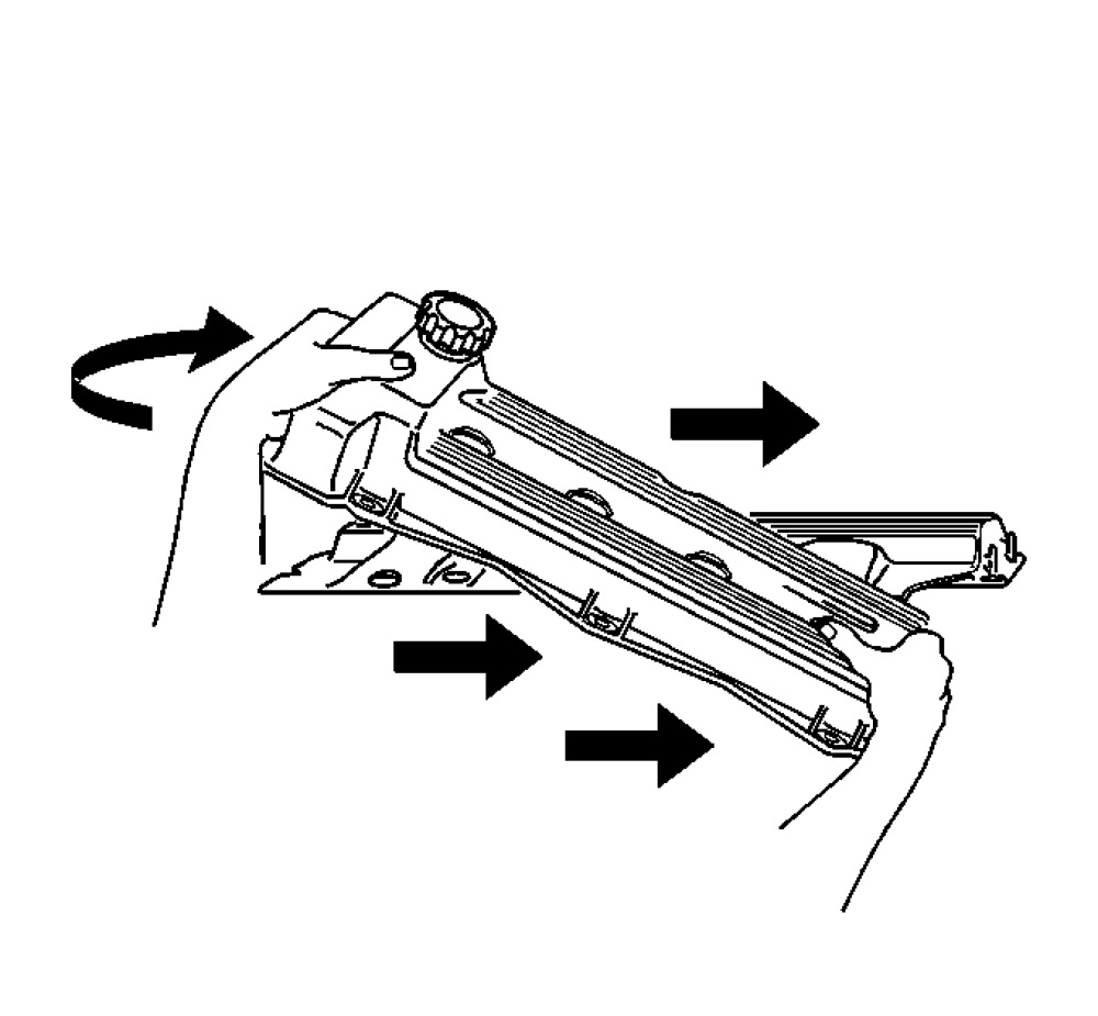 18. Move the cover upward and pivoting such that the edge of the cover closely follows the left edge of the intake manifold cover.