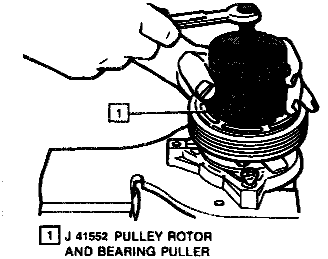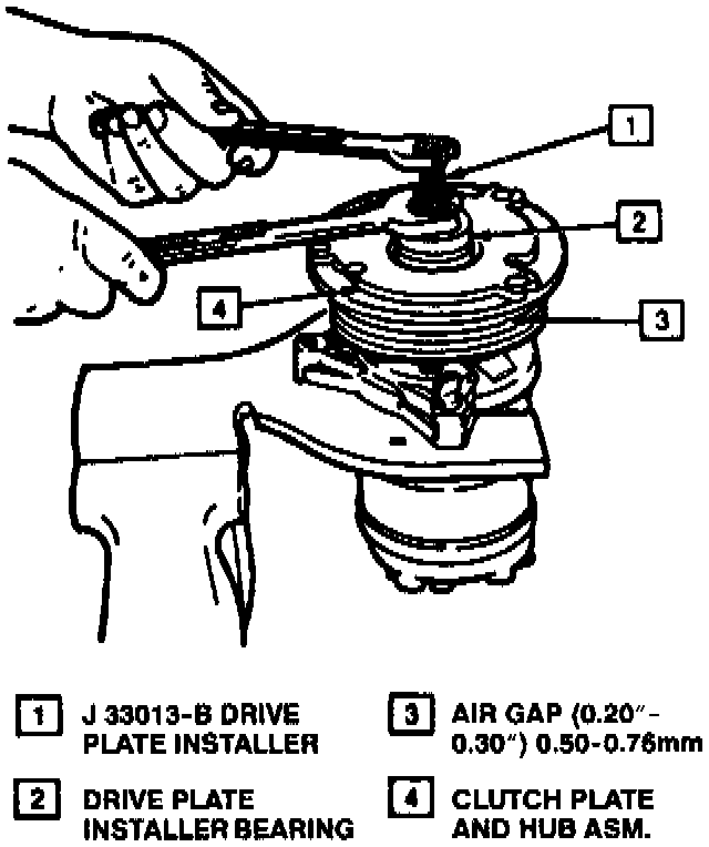 5. Install the clutch plate and hub installer-remover J 33013-B with bearing as shown in the illustration.