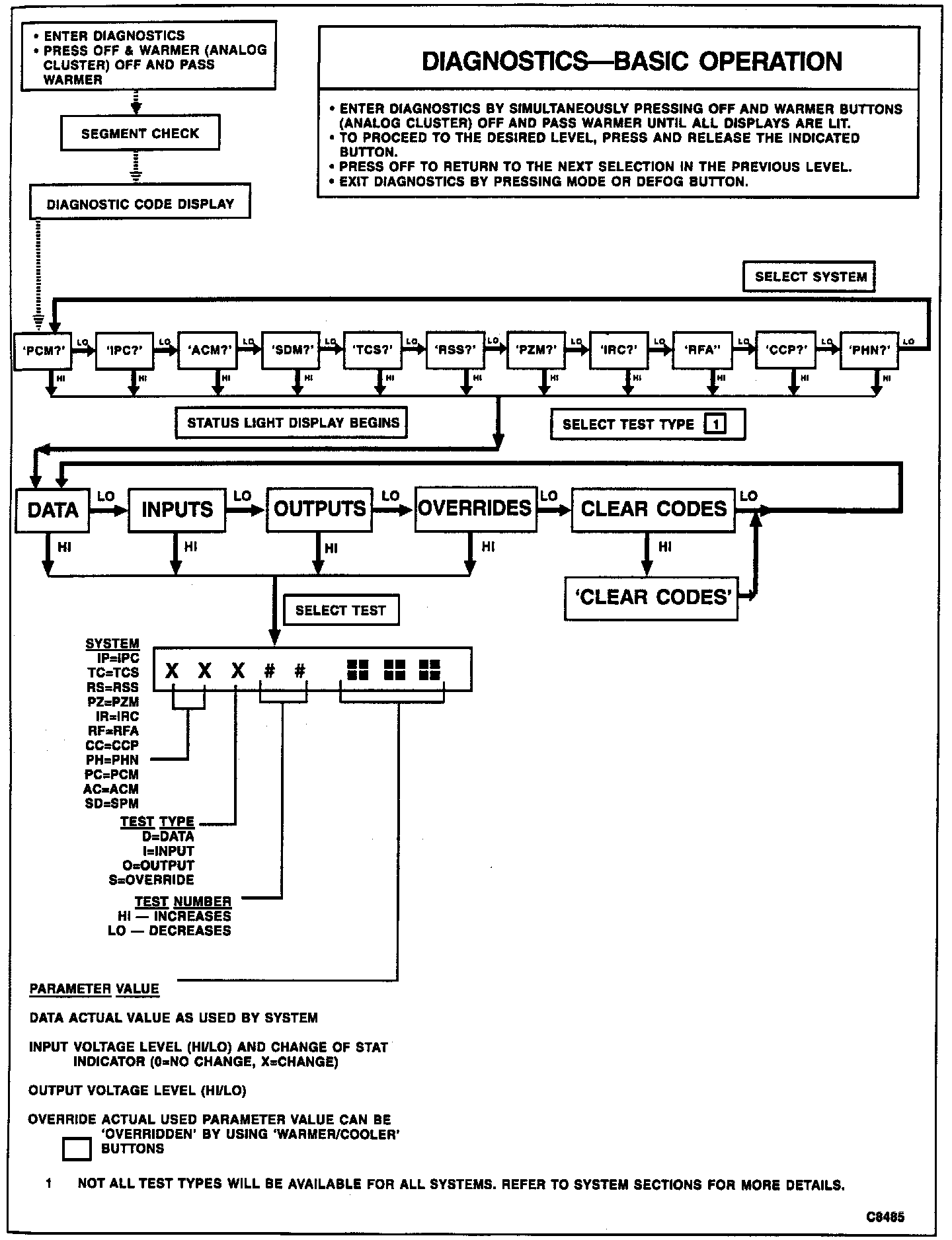 Having selected a system, the first available test type will be displayed (i.e. PCM DATA?, PCM CLEAR CODES?). While selecting a specific test type, any of the following actions may be taken: