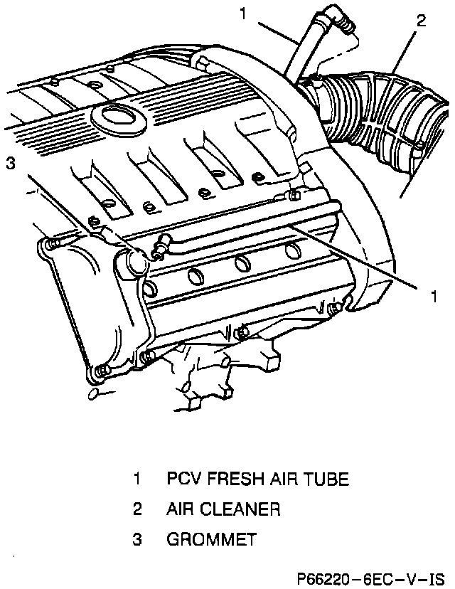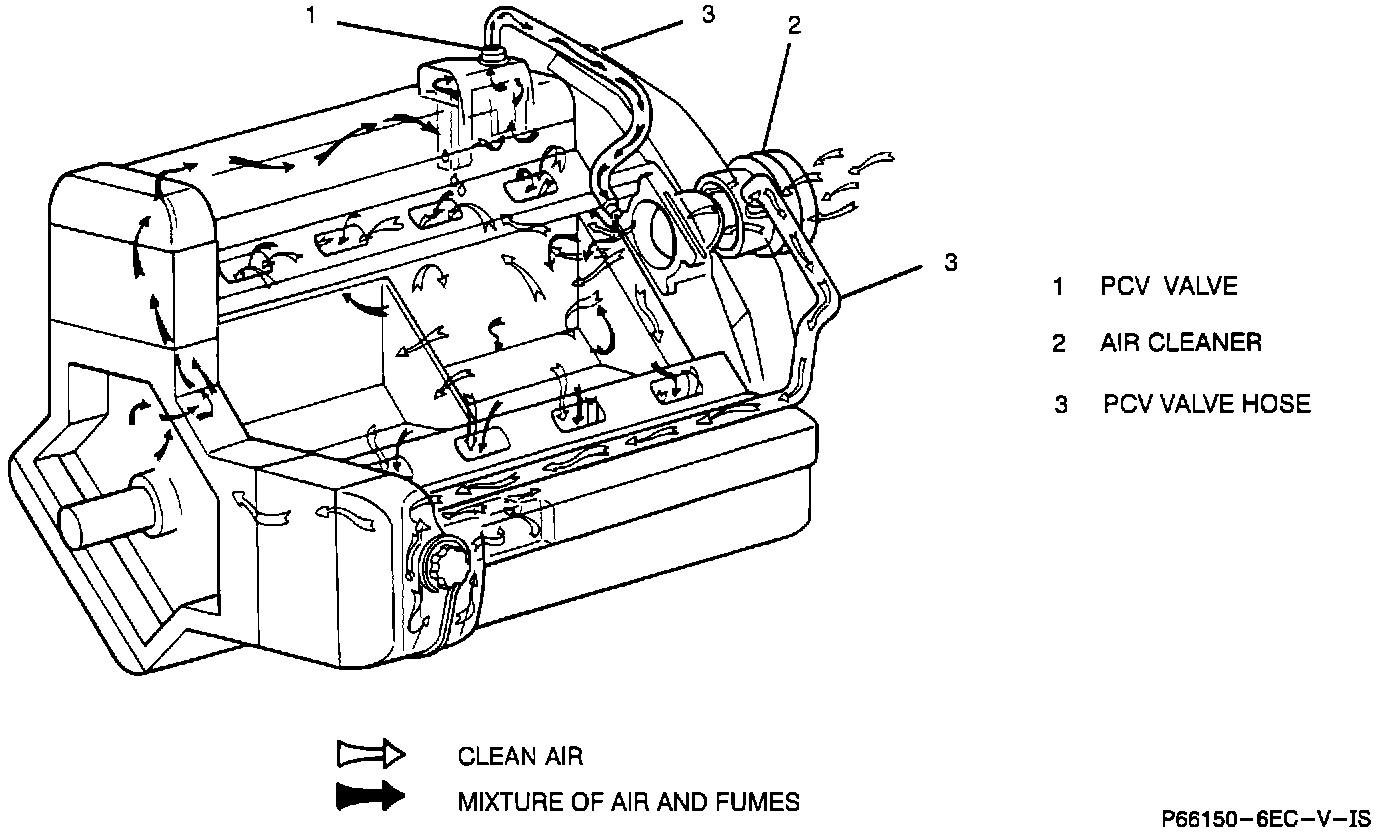 A Positive Crankcase Ventilation (PCV) system is used to prevent blow-by gases from escaping to the atmosphere by routing them through a vacuum controlled ventilation valve, into the intake manifold. Fresh air from the air cleaner is pulled into the crankcase, mixed with blow-by gases and then combined with the air/fuel mixture and are burned in the combustion chamber.