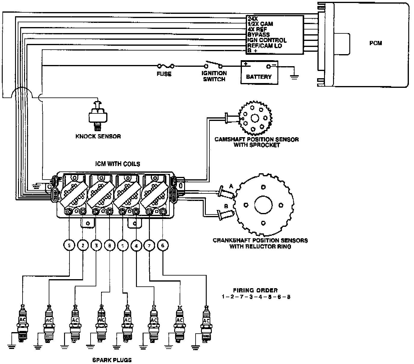 ^ The camshaft position sensor provides the IC module with cylinder # 1 firing order information, which the PCM uses for sequential fuel injection.