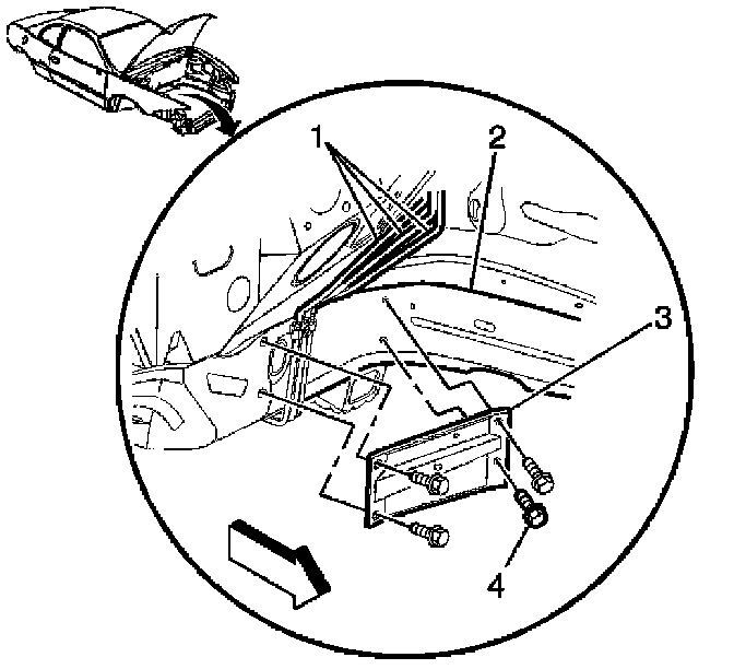 16. Remove the four bolt (4) attaching the brace (3) between the body rail (2) and the lower cowl sheet metal. Remove the brace.