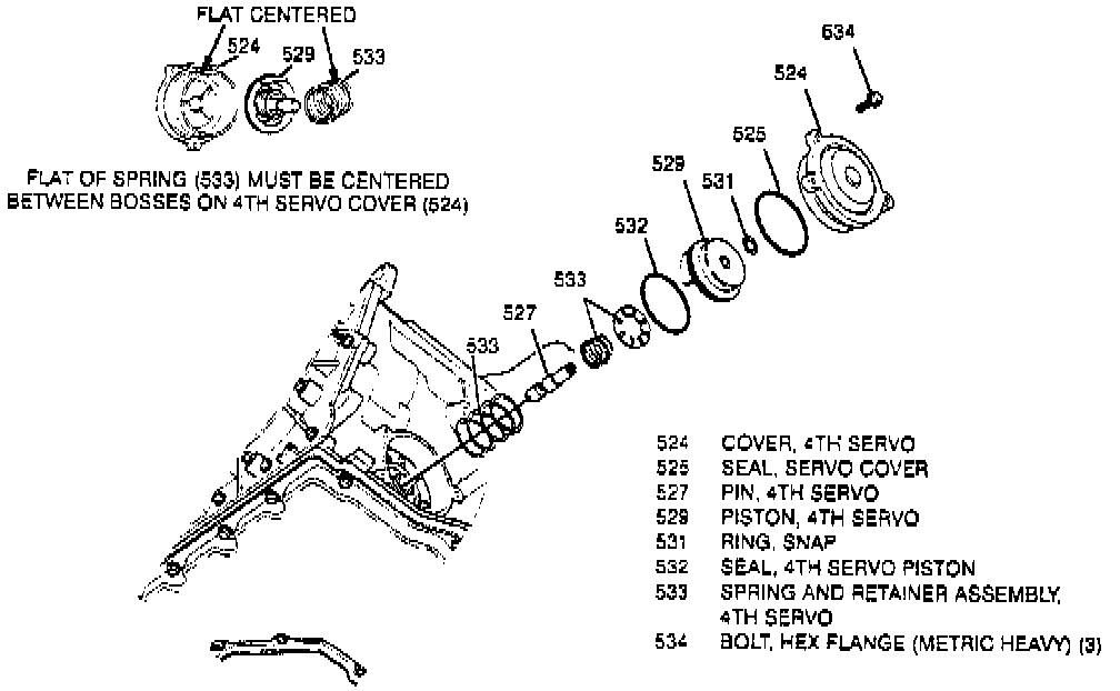 2. Install 4th servo and large spring into cover. Ensure tab on piston is aligned with notch in case bore (early models).
